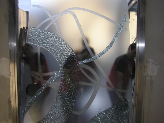 Hemos colaborado en diversas ocasiones con Comglas, en este caso ayudamos con la fabricación en nuestros hornos de algunas piezas, para posteriormente hacer el transporte y la colocación de dos piezas de vidrio en el despacho de dirección de una entidad bancaria valenciana en una séptima planta, en pleno centro de Valencia.